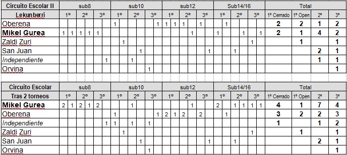 La clasificación del Circuito escolar, tras la disputa del segundo torneo la vemos de esta forma según los puestos por clubes: