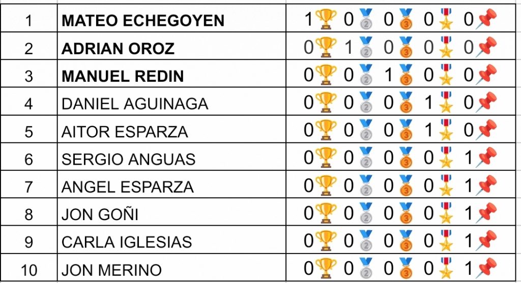 La clasificación parcial en cuanto a los premios viernes tras viernes no difiere en nada de la de la primera prueba. Se queda así tras un torneo disputado:
