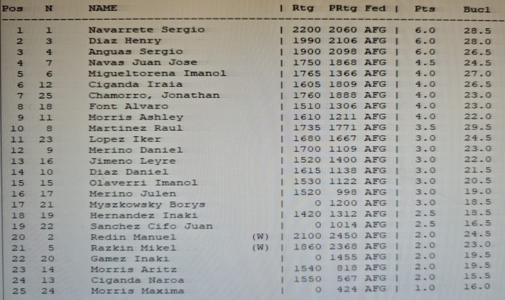 Los tres jugadores que coparon los puestos en los que se repartían los premios tienen sobre sus espaldas una dilatada experiencia y bien seguro que desarrollaron sobre el tablero líneas ingeniosas y profundas. Por ello, los tres obtuvieron una amplia ventaja sobre todos los demás (6/7). Lo bonito de esta quinta prueba fue, además, que entre ellos tres hubo victorias y derrotas en los enfrentamientos particulares, teniendo que dejar a la suerte del buchholz dictaminar quién se habría de alzar con el título. Al final el campeón fue Sergio Navarrete, que aventajó en sólo medio punto de desempate a Henry Díaz y únicamente dos enteros a Sergio Anguas. Esta manifiesta igualdad hizo las delicias de los propios jugadores, que se tomaron con deportividad los resultados, analizando posteriormente las partidas y aprendiendo aún un poquito más de este deporte que tanto amamos.