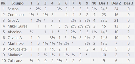 En este enlace puedes ver la clasificación final, en la que el vencedor fue el ucraniano GM Ruslan Ponomariov con 8/9 puntos, empatado con el cubano GM Carlos Daniel Albornoz. la mejor jugadora fue Leyre Abrísqueta en el puesto 24 con 5/9.
