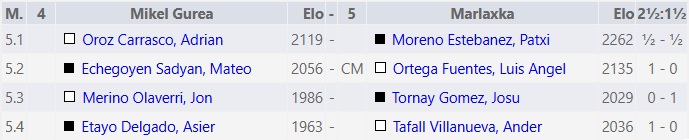31- Gorka González 4,5/9: Gorka fue la alegría del club durante la primera parte del torneo, ya que se marcó unos incontestables 4/5 para empezar. Eso le llevó a jugar en la mesa 2 ante GM Carlos Daniel Albornoz, que le pilló algo de ventaja en la apertura. Se dio el homenaje de medirse ante tres profesionales.
