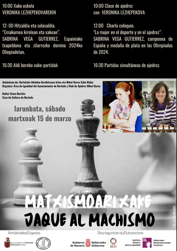 Dentro de las propuestas de crecimiento y desarrollo que viene organizando desde hace un tiempo el Club de Ajedrez Mikel Gurea, anunciamos la llegada a Burlada de la mejor jugadora de ajedrez del panorama nacional: MI Sabrina Vega. También contaremos con la participación de WFM Veronika Lezhepekova.
