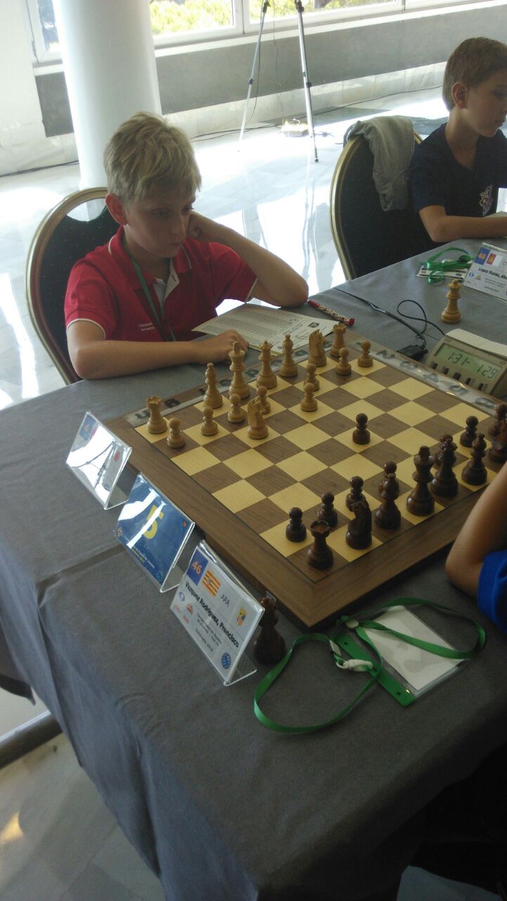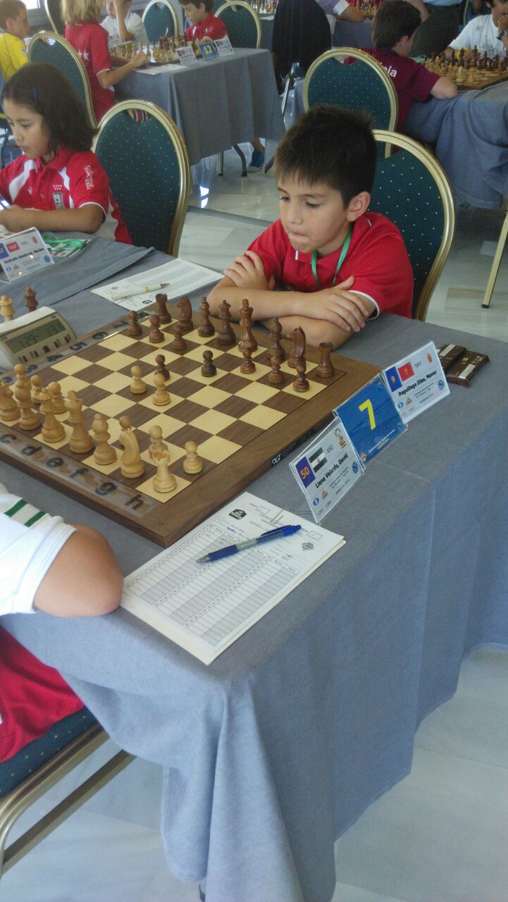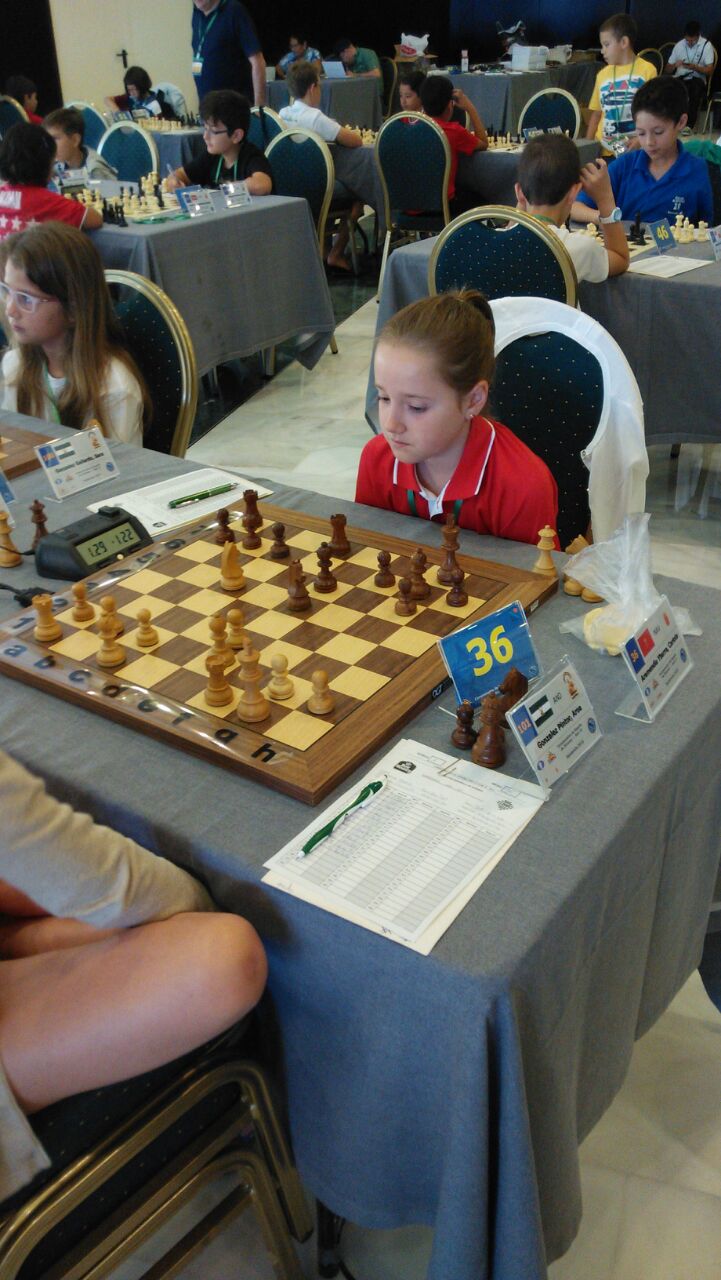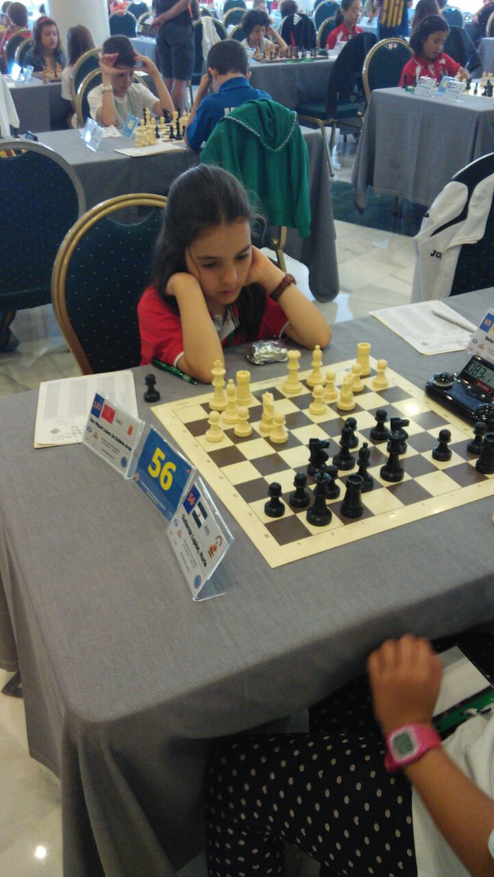 Según el sol va ascendiendo los peques van saliendo de la sala y las noticias empiezan a ser buenas: Alex, Manex y Carlota ganan, Aroa consigue unas meritorias tablas que le aseguran aparecer en la próxima lista de ELO y el resto de la delegación navarra también logra en general buenos resultados: victorias de Marta, Nicolás y Niobe y derrotas, no sin antes plantear una dura batalla, de Ines, Leyre y Elena.