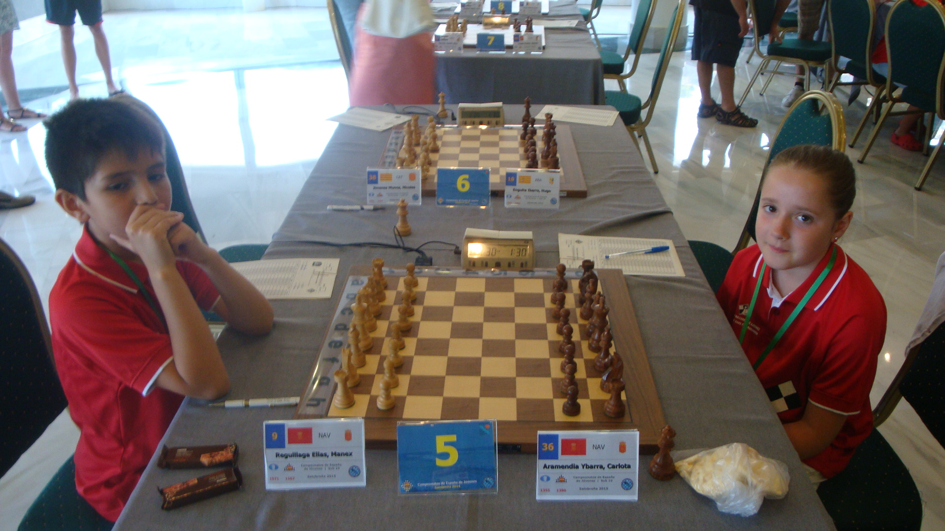 Comienza la ronda. Aroa compensa la matada de la partida de ayer a la tarde y gana en 25 minutos ¡a disfrutar de la piscina durante todo el día! Marta también acaba pronto, su rival gentilmente le regala una pieza en la jugada 5, por lo que la partida no dura mucho. Elena parecido, gana rápido su partida y estrena su casillero personal. El resto de partidas tardan más en acabar. Por orden de finalización: Leyre va consiguiendo peoncitos de ventaja hasta que finalmente consigue coronar y dar mate, Inés lucha mucho pero finalmente no consigue afinar y acaba perdiendo su partida, Alex se precipita en varias jugadas y deja que su rival monte un ataque indefendible que le hace inclinar el rey, Manex y Carlota juegan una partida de lo más interesante y entretenida (con idas y venidas incluidas) que acaba ganando el morenito, Nicolás lo hace muy bien, pero en un momento dado comete un error fatal que le priva de puntuar, Niobe lucha como una campeona hasta el final, pero el cansancio hace que pasadas las 2 horas 30 minutos se equivoque y acabe perdiendo la partida.