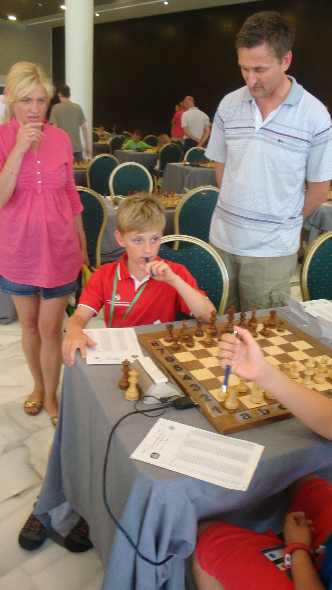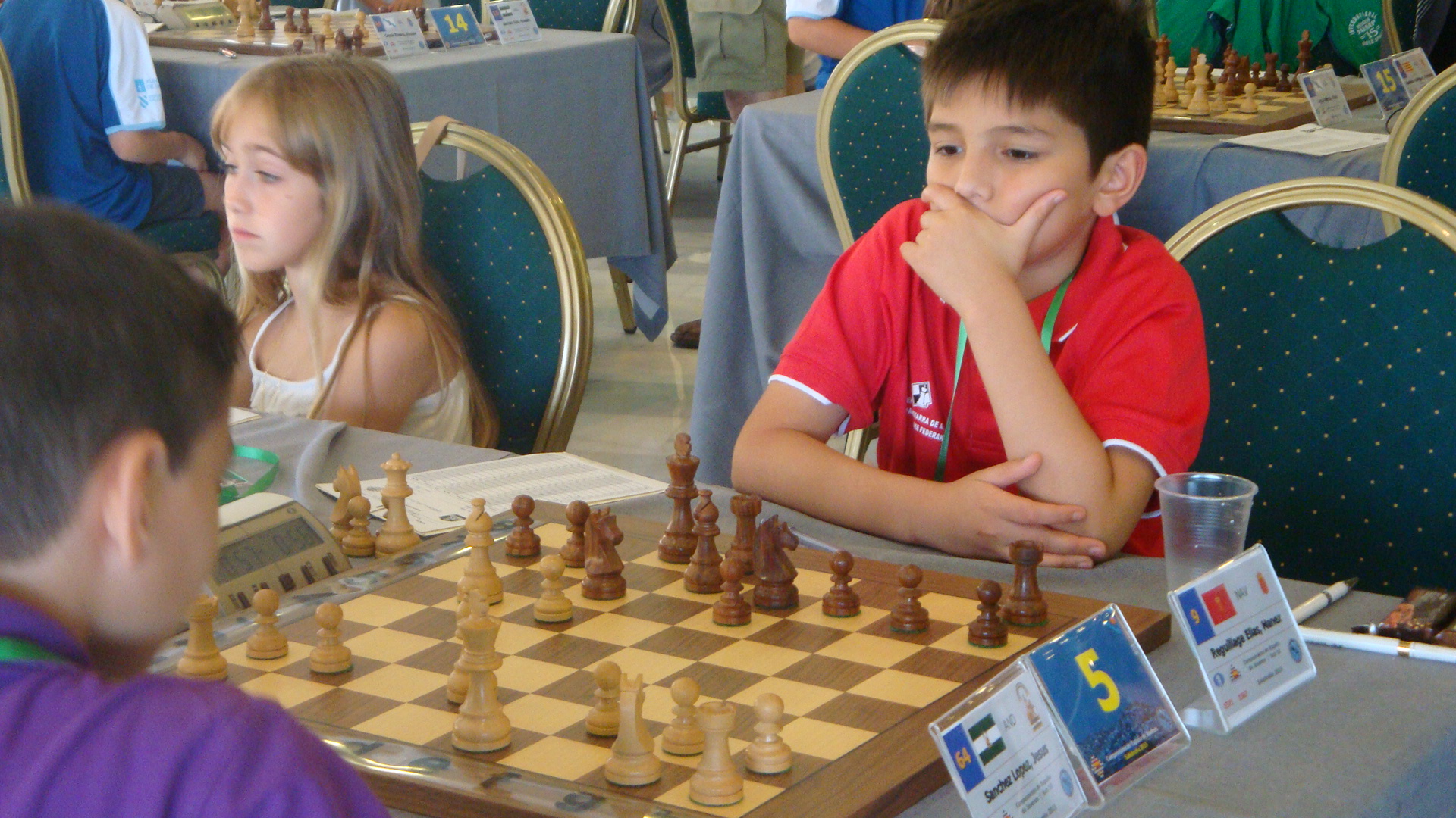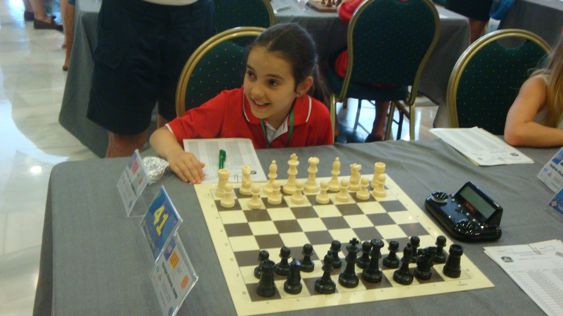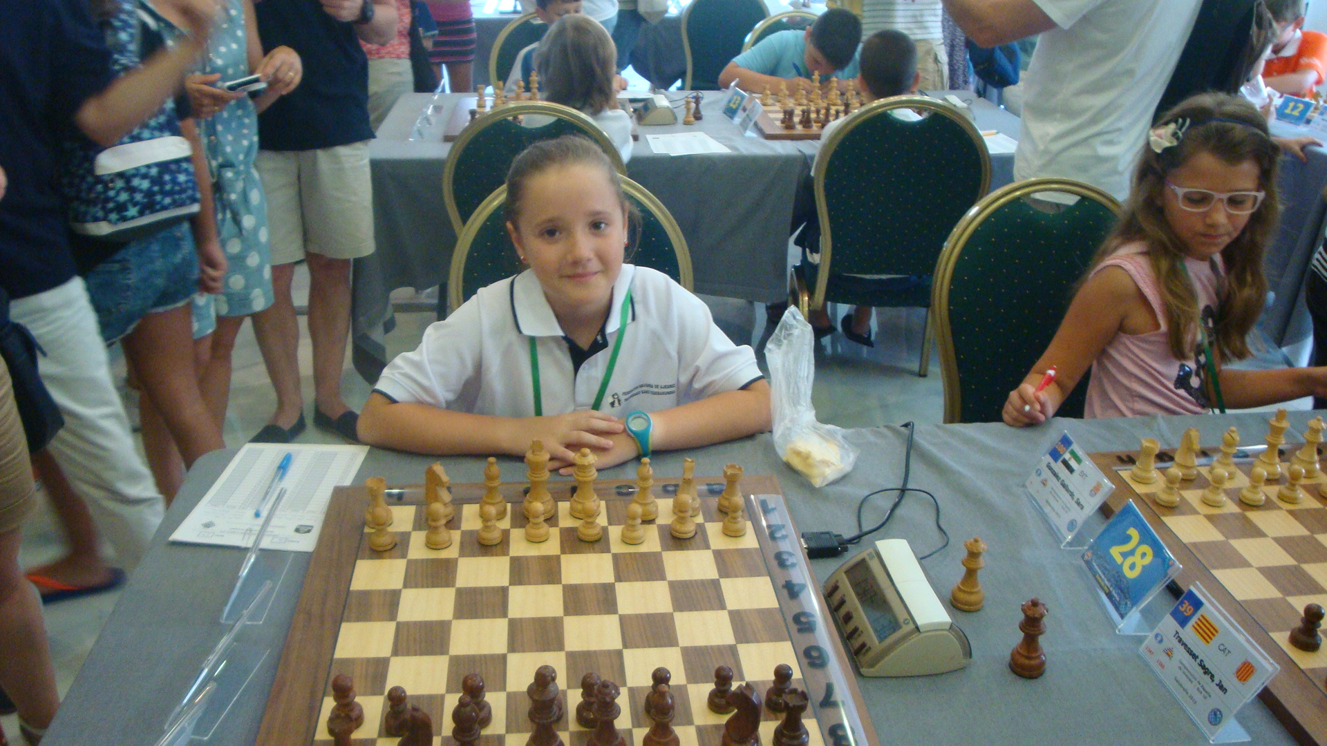 A las 9.40 una horda de peques y no tan peques acudimos a la sala de juego. Vamos con tanto tiempo de margen que llegamos incluso antes de que abran la sala. No pasa nada, a la sombra el amigo Lorenzo no tiene tanta fuerza. Pasados menos de 5 minutos se abren las puertas, todos van a sus sitios y a las 10.00 los no acreditados abandonan la sala por petición de los árbitros.