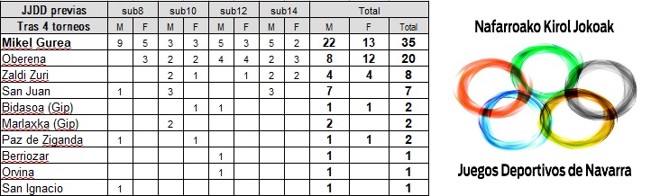 El último de los torneos de la primera fase clasificatoria para la chavalería de cara a meterse en las finales que tendrán lugar durante las vacaciones de Semana Santa terminaron con el billete obtenido por cinco chicos y dos chicas. Felicidades a Ekaitz Mayordomo, Jon Merino, Jon Goñi, Jon Ariz, Daniel Pérez, Ariane Echeverría e Irene Vallejo. Con estos 7 nuevos jugadores son ya 35 los niños y niñas clasificadas (de 79), lo que implica que el 44% de la lista de finalistas pertenecen a Mikel Gurea. ¡Espectacular!