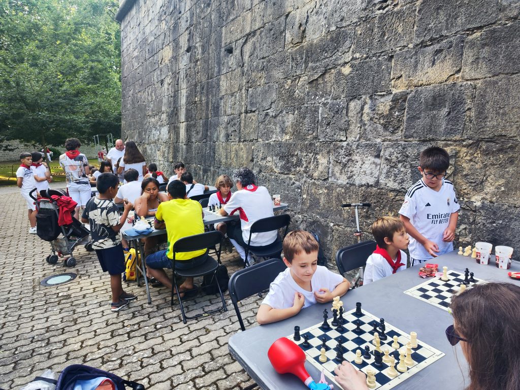 La iniciativa municipal de Kirol Ari, que acerca a los más pequeños la práctica del deporte, volvió a desarrollarse este año durante las Fiestas de San Fermín. Son ya varios años en los que el Ayuntamiento de Pamplona promociona otro tipo de actividades de ocio, fuera de los efectos nocivos del consumismo y el acinamiento que en ocasiones padecemos en la capital navarra por estas fechas. Y el ajedrez no falta a la cita.