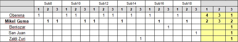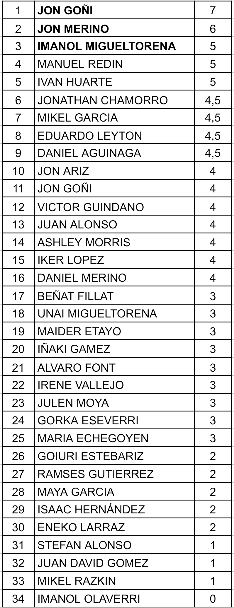 16- Amaiur Ikastola Gorriak (11 – 21): A esta escuadra aún le quedan muchos años por delante y su desempeño en la competición ha sido extraordinaria; son sub9 y sub10. Con ellos, los tres equipos de la ikastola Amaiur se posicionan entre los 16 primeros de 72 conjuntos inscritos; pura poesía. Iker Sánchez (3) bregó en la mesa 1 y más abajo Hugo Fuentes (5), Ibai Monje (6) y Arhane Fuentes (7) se salieron sumando puntos para el tercer equipo de forma brillante. ¡Zorionak!