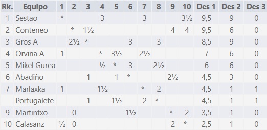 Tras la disputa de tres jornadas, Sestao arrebata el título a Conteneo, aunque ambos se mantienen en todo lo alto con 9,5/12. Gros A les sigue el juego con 8,5, destacándose ya un poco los tres llamados a priori a copar el podio. Orvina A con 7 y Mikel Gurea con 6 les seguimos, pero mirando con recelo qué sucede abajo. Martintxo y Calasanz repiten puestos en la zona de descenso con 3,5 y 2,5 puntos respectivamente al empatar 2-2 entre ellos.