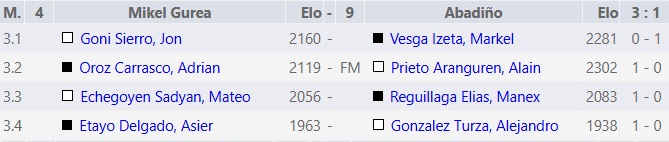 Esta tarde era la del debut de Asier Etayo con el club en Liga Vasca después de haberlo hecho ya con el primer equipo en el absoluto navarro en la última ronda foral. Le tocó en la mesa donde ante Alex González, que subió del segundo equipo. La iniciativa en la primera parte de la partida tuvo el de Abadiño, pero tras ceder material el jugador visitante se echó para atrás cuando aún podía quemar las últimas naves, pensando más en defender que en atacar. En ese escenario Asier fue letal y sumó el segundo punto tras casi tres horas de juego.