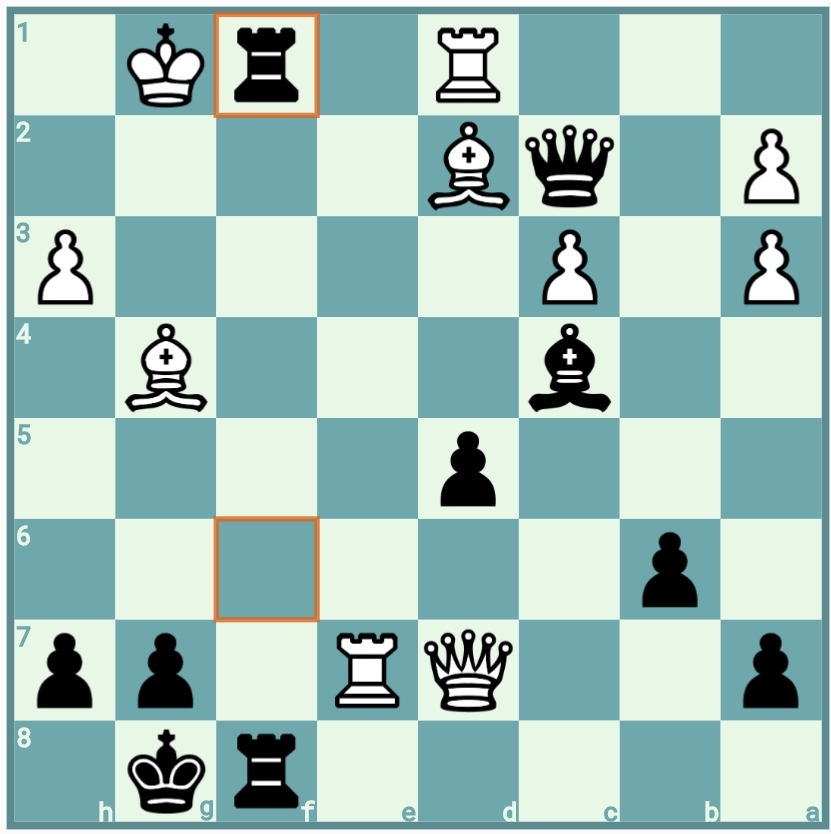 Momento en el que las negras pierden la iniciativa y decantan la partida para las blancas. 1…Tf1. 2.TxT,TxT+. 3.Rg2,DxA+. 4.Ae2 y las amenazas en séptima y octava de las blancas decantan la balanza.