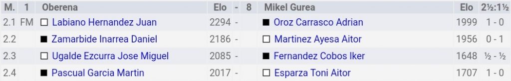 La penúltima ronda nos emparejaba con Oberena, en un derbi navarro que lleva tres años repitiéndose en la categoría de plata de la Liga Vasca. Los dos equipos llegábamos con objetivos y miras bien distintos. Los de verde harían de locales en esta ocasión y parece que se les escapan las posibilidades de ascender a División de Honor, mientras que para los de naranja las necesidades son más que acuciantes. La diferencia entre ambos equipos en la tabla es tan solo de 1,5 puntos… Pero a 4 tableros es casi un mundo. Además, un Oberena vs Mikel Gurea siempre es un encuentro vibrante, sea cual sea el escenario.
