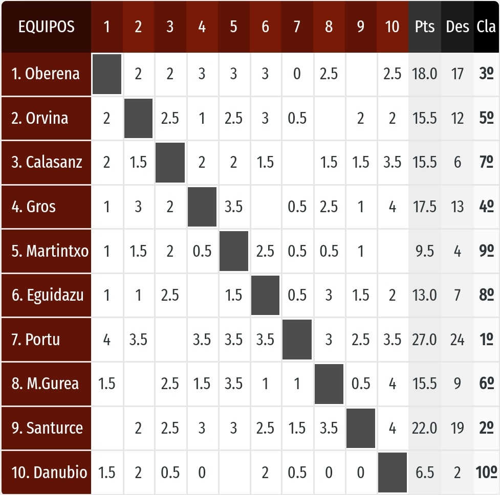La última ronda nos depara un dramático derbi contra Orvina en tierras alavesas al disputarse la misma con todos los equipos juntos. Tres equipos en la pomada para ¿un descenso?: Calasanz, Orvina y Mikel Gurea. A continuación vemos la tabla cruzada de resultados, sacada de la página de Egidazu.