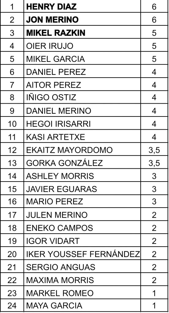Una gran igualdad entre los primeros clasificados brindó a los aficionados a las rápidas una bonita tarde de juego. En lo más alto empataron Henry Díaz y Jon Merino con 6/7 puntos, llevándose el campeonato el veterano de MD por mejor desempate pese a haber caído derrotado frente al sub10 de MG en el emparejamiento entre ambos. Las dos tablas de Jon en las rondas anteriores le birlaron su primer entorchado y otorgaron a Henry su tercera copa. El tercer puesto de la tabla se lo adjudicó Mikel Razkin al comandar con 5/7 un potente grupo de buenos jugadores a este ritmo. La suerte del desempate le sonrió por haber enfrentado a los dos de arriba precisamente.