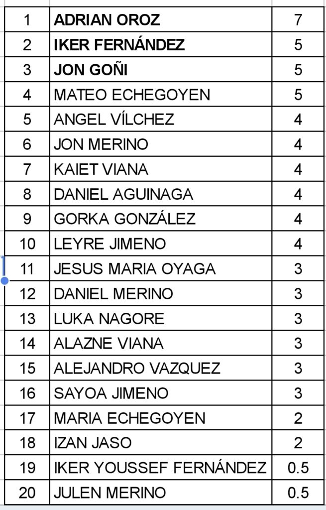 El campeón de este viernes fue de nuevo Adrián Oroz, que consigue su segundo entorchado consecutivo. En esta ocasión no dio ninguna opción a sus compañeros y nuestro sub16 empalmó victotia tras victoria para lograr el pleno 7/7. A continuación en la clasificación trataron de seguir la estela del vencedor Iker Fernández y Jon Goñi, ambos con 5/7, pero cedieron demasiados puntos al enfrentarse a diversos rivales de entidad.