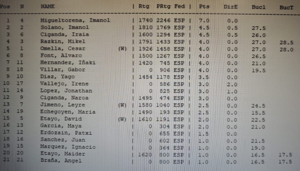 La competición tuvo lugar unos días antes de las vacaciones de Semana Santa, lo que estábamos seguro de que atraería a mucha gente con ganas de quitarse el gusanillo de cara al descanso primaveral. El mejor fue sin lugar a dudas Imanol Migueltorena, que vio recompensado su buen momento de forma táctico con la consecución de unas cifras espectaculares. Sus 7/7, pleno de victorias, lo dejaron en solitario en lo más alto, demostrando un estar un paso por delante de los demás. Para el resto de posiciones la lucha no tuvo cuartel y en un punto se colocaron nada menos que ocho ajedrecistas, siendo los dos que se llevaron el gato al agua con 4,5/7 Imanol Solano e Iraia Ciganda. Ambos destacaron por medio punto sobre todos los demás, regalándose un buen puesto en la tabla general.