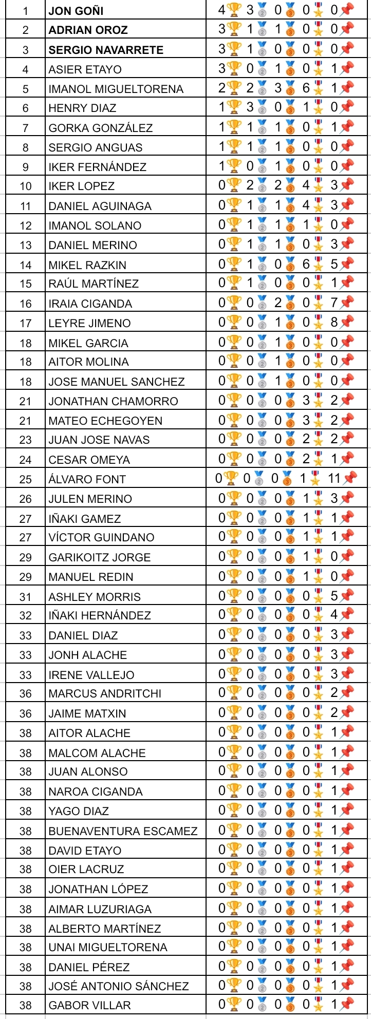 Con la victoria de Imanol Migueltorena se aprieta la zona alta de la tabla. Jon Goñi se mantiene en lo más alto con tres (Adrián Oro, Sergio Navarrete y Asier Etayo) a un solo campeonato. Muchísima igualdad.