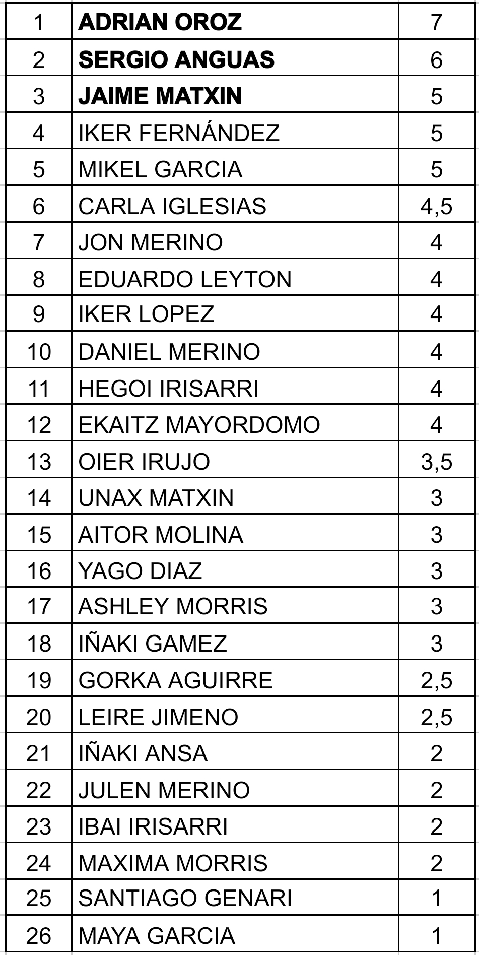 Este torneo contó con muchos y muy buenos jugadores, algunos de ellos verdaderos especialistas en la materia. El campeón de esta edición fue Adrián Oroz, que sumó su cuarto entorchado para alcanzar a Henry Díaz en lo más alto de la tabla clasificatoria. Su puntuación fue perfecta al sumar 7/7, por lo que no dio oportunidad a sus seguidores a la hora de optar al triunfo. Con 6/7 finalizó Sergio Anguas, que lleva una buena racha de juego y resultados. Se nota que ha vuelto a entrenar, por lo que sus 6/7 dan fe de ello. El tercer puesto fue para un debutante, Jaime Matxin, que después de sus 5/7 bien seguro que está vuelta por el club las próximas semanas. Por lo demás, todo un disfrute poder ver compitiendo sobre el mismo tablero a niños y niñas de primer año frente a veteranos con una experiencia tremendamente contrastada. ¿Quién dijo miedo?