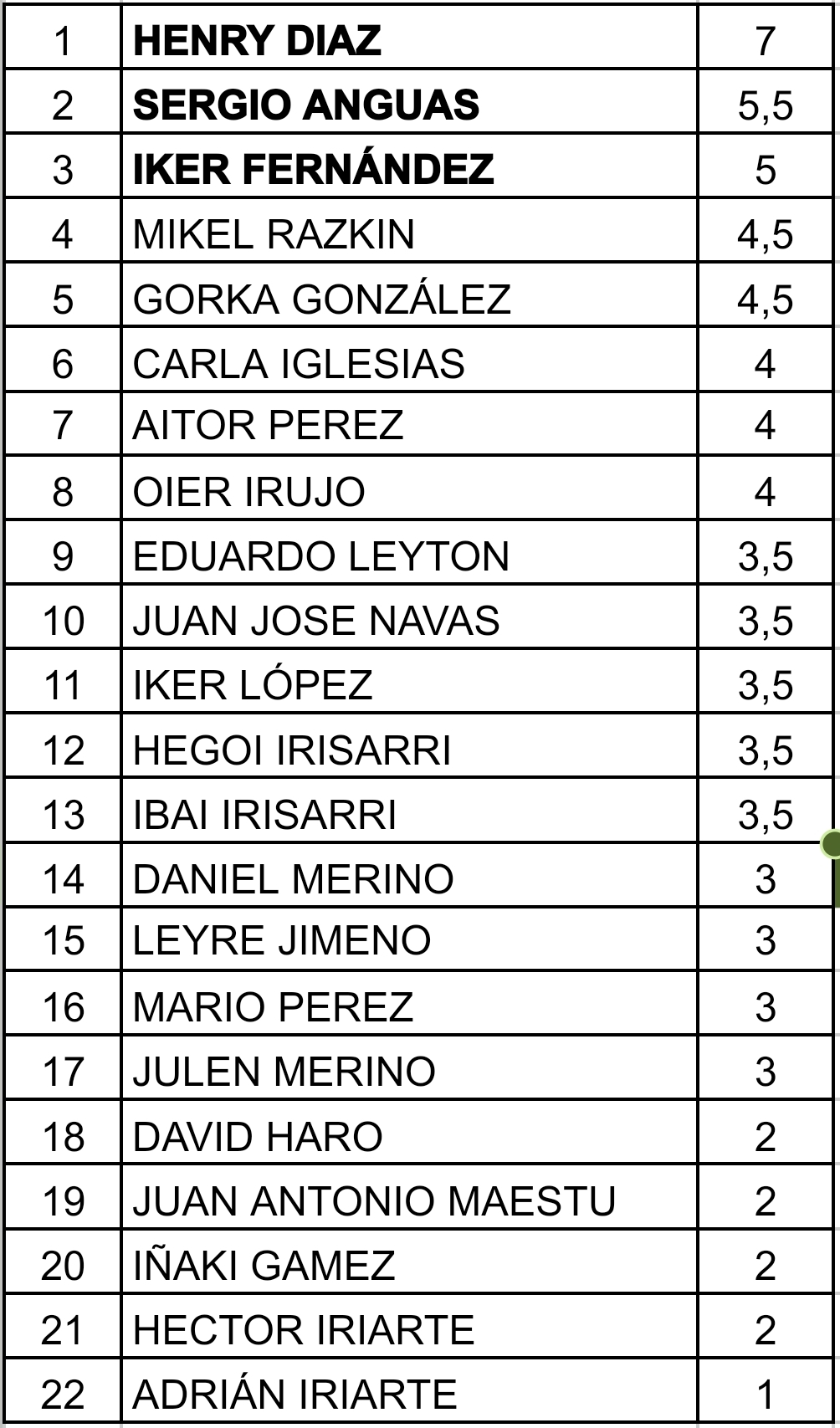Henry Díaz llevaba unas cuantas semanas sin acudir al tradicional torneo de los viernes. Le echábamos de menos. Y fue volver y recuperar las sensaciones nada más plantarse frente al tablero. Se adjudicó la prueba con pleno de victorias tras sumar 7/7. Tras esta muestra de autoridad, en la tabla quedó Sergio Anguas, que cifró su participación en 5,5/7 después de realizar una muy buena partida ante el campeón, pero que no fue sufriente para anotarse el tanto. El bronce se lo adjudicó Iker Fernández al obtener 5/7 y sólo ceder puntos ante los dos primeros clasificados. Buen torneo y mejor ambiente el vivido en nuestra sede.