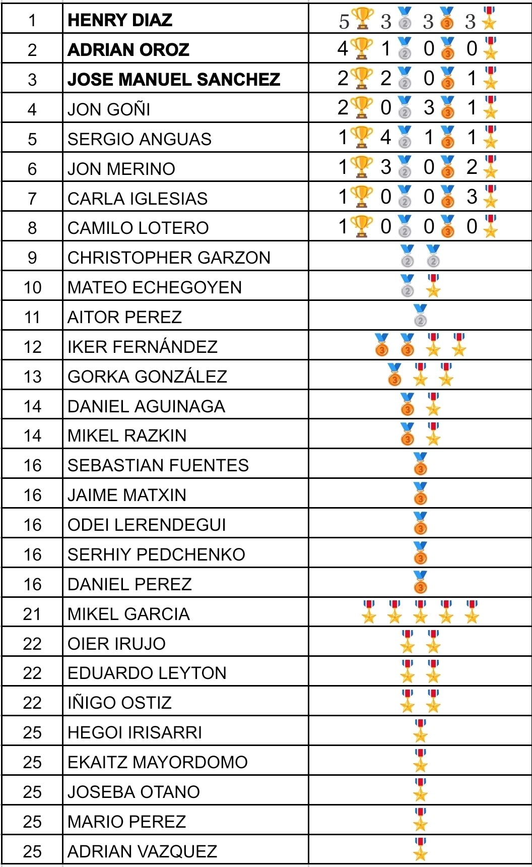 Tras diecisiete pruebas disputadas, la tabla de los Torneos de los Viernes se ve así: