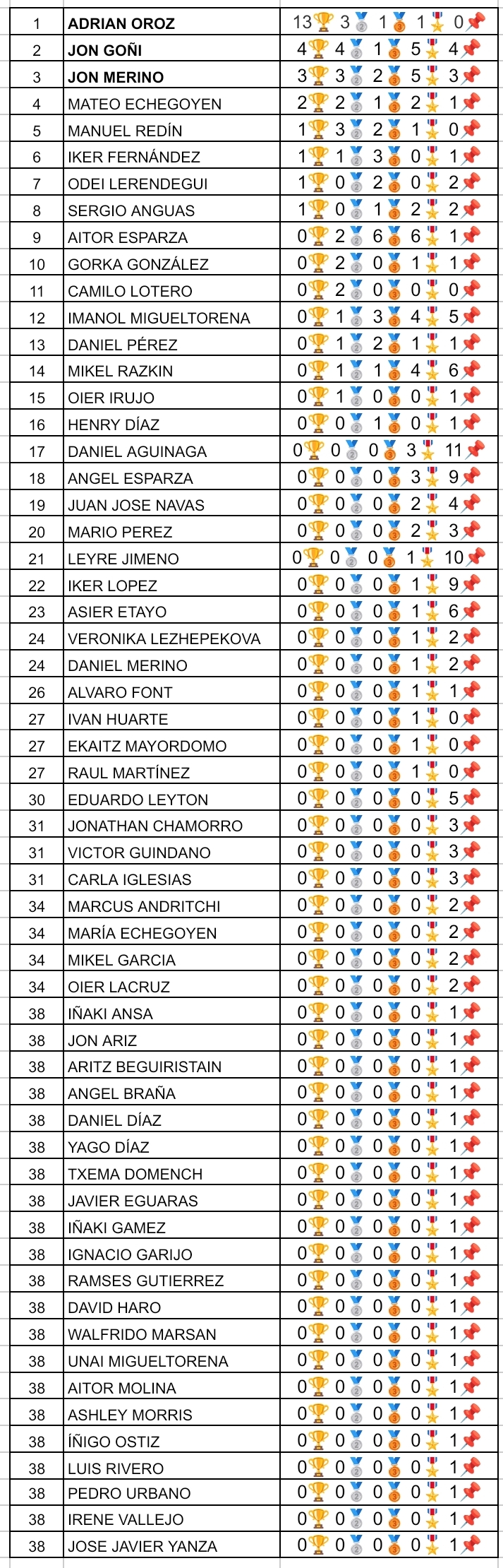 Y en lo que respecta a la tabla general, tras 26 pruebas a Adrián Oroz ya no hay forma de que lo saquen de ahí. Aquí la clasificación:
