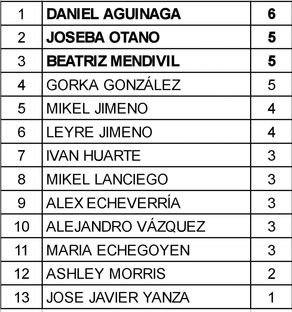 En esta última edición la participación fue algo más escasa que en las anterior, si bien es cierto que el buen tiempo y la apertura de las piscinas después del largo invierno/primavera llama a salir a la calle y tomar algo de aire fresco. Pero allí estuvieron trece incondicionales… El torneo estuvo copado, por primera vez en las veintisiete ediciones de esta temporada, por tres adultos, que por fin se desquitaron de los jóvenes que tanto potencial atesoran. El último de los campeones fue Daniel Aguinaga, que no pudo conseguir el pleno de victorias 6/7, pero le dio para subirse a lo más alto del escalafón merced a su buen conocimiento y estudio teórico. Le siguieron tres compañeros con la misma puntuación (5/7), a quienes la suerte del bucholz les mandó a uno u otro puesto. La plata se la adjudicó Joseba Otano, que acude siempre que puede a calentar motores y batirse el cobre, mientras que el bronce se lo llevó a casa Beatriz Mendívil, una jugadora mucho más experimentada en ritmos más pausados, pero qué poco a poco va haciéndose hueco en el blitz.