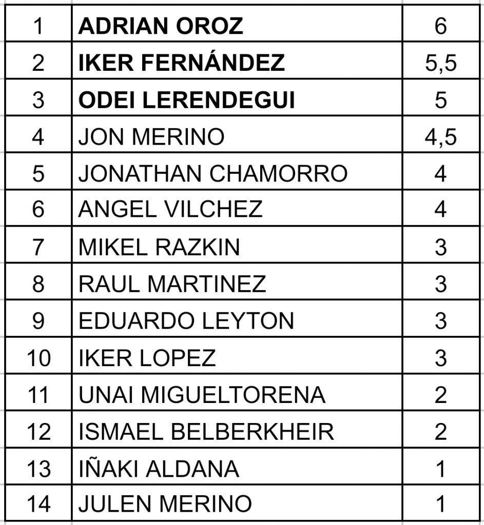 La lucha por la victoria en el torneo se vio mezclada también con el triunfo en el circuito de la temporada. Llegaron Henry Díaz y Adrián Oroz empatados, aunque con ventaja de Henry debido a un mayor número de subcampeonatos. La pena fue que el líder no pudo venir a la disputa de este último campeonato. En la prueba Adrián se impuso con 6/7, pese a perdió ante uno de los rivales que le perseguía. Pero es que sus seguidores, Iker Fernández con 5,5/7 y Odei Lerendegui con 5/7, no consiguieron alcanzarle, por lo que se alzó con la victoria particular y la general al mismo tiempo. Una gozada que todo se dirimiera en el ultimo momento.
